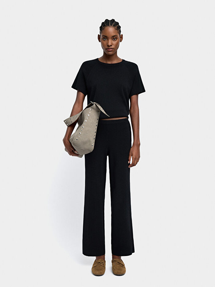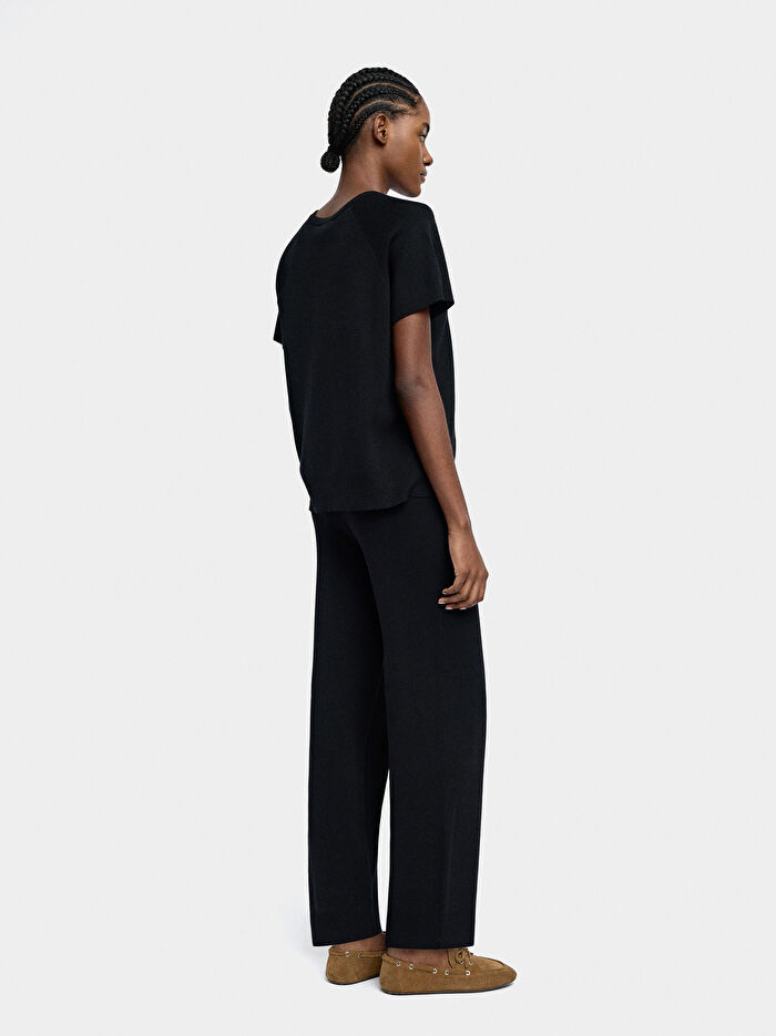 Yuvarlak yakalı örgü t-shirt. Kısa kollu. Nervürlü kenarlar. Model 1.80 m boyunda ve XS-S beden giyiyor.