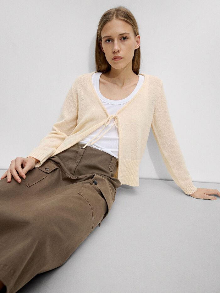 Yünlü örme hırka. Fiyonk kuşaklı. Uzun kollu. Kenarları fitilli. Model 1.75 m boyunda olup XS-S beden giymektedir.