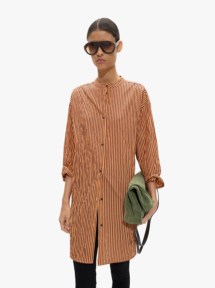 Pamuklu çizgili kısa gömlek elbise. Mandarin yaka. 3/4 kol. Düğmeli açıklık. Model 1.79 m boyunda ve XS-S beden giymektedir.