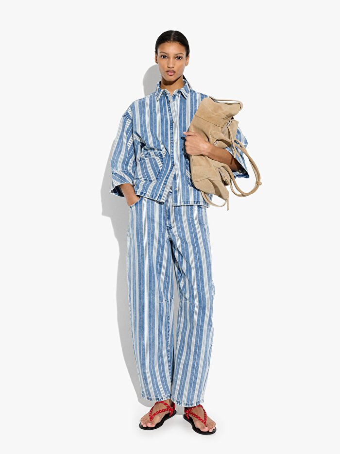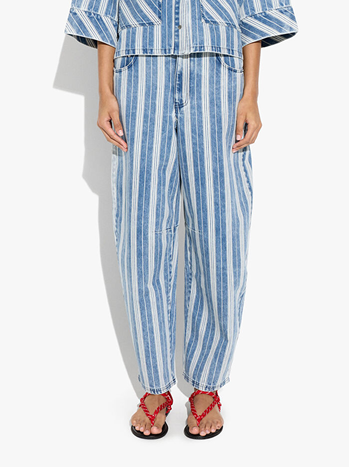 Çizgili denim pantolon. Yıkanmış efekt. Balon kesim. Ön ve arka kısımda cepler. Düğmeli ve Fermuarlı.