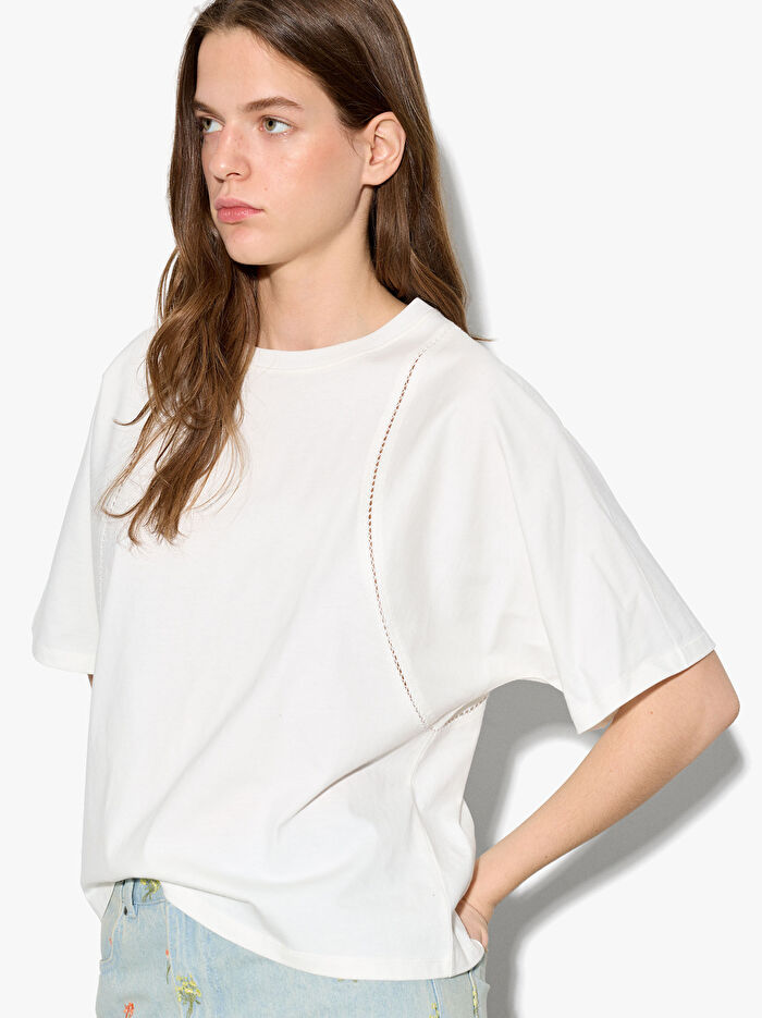Düz kumaş pamuklu t-shirt. Yuvarlak yaka. Kısa kollu. Yan delik detayı. Model 1.75 m boyunda ve XS-S beden giymektedir.