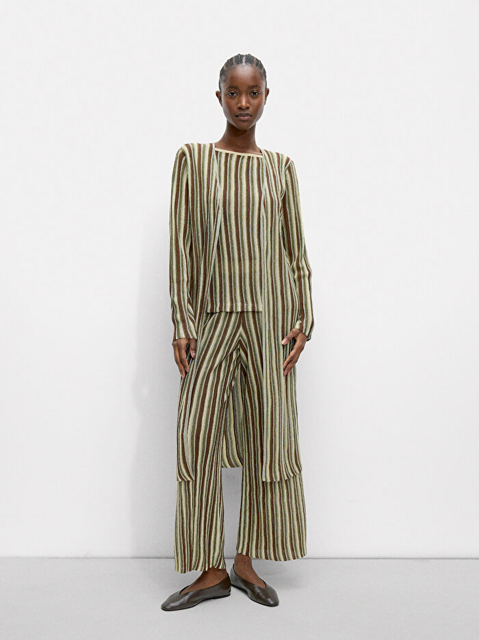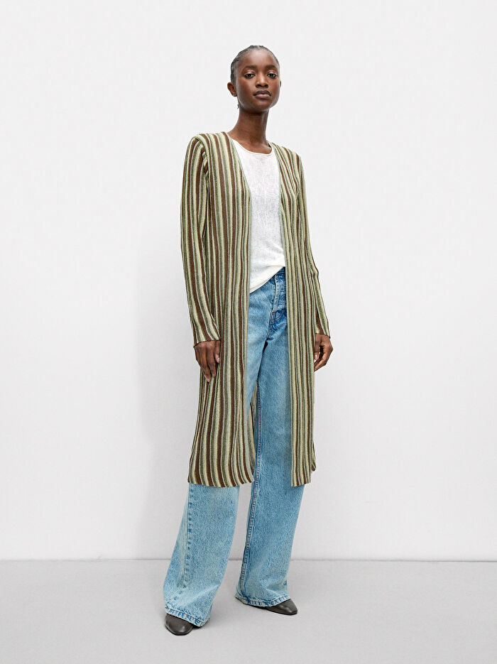 Uzun fitilli çizgili örgü hırka. Uzun kollu. Parlak efekt. Model 1,76 m boyundadır ve S beden giymektedir.