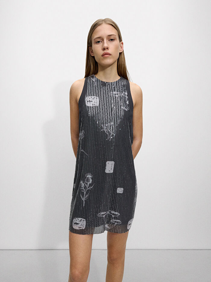 Payet desenli kısa elbise. Yuvarlak yaka. Kolsuz. Arkası fermuar kapamalı. Model 1.75 m boyunda olup S beden giymektedir.