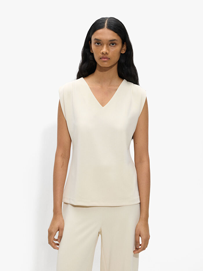 Pamuktan üretilmiş düz bluz. V yakalı. Kolsuz. Omuzlarda pileli detay. Model 1,77 m boyunda ve XS-S beden giyiyor.