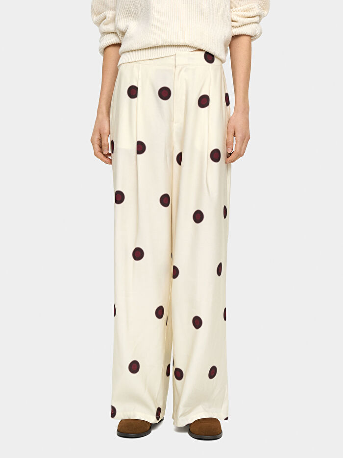 Pileli ve puantiyeli desenli bol pantolon. Düğme ve fermuarlı yırtmaç. Yan cepler. Model 1,77 m boyunda ve S beden giyiyor.