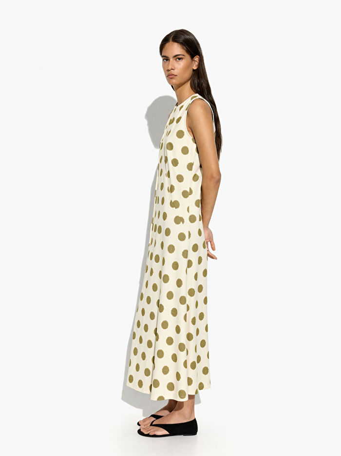 Pamuktan üretilmiş puantiyeli baskılı uzun ve bol elbise. Bir tarafta bağlanan askı detaylı yuvarlak yaka, V yaka dönüşümüne olanak tanır. Kolsuz. A kesim. Model 1.76 m boyunda ve XS-S beden giymektedir.