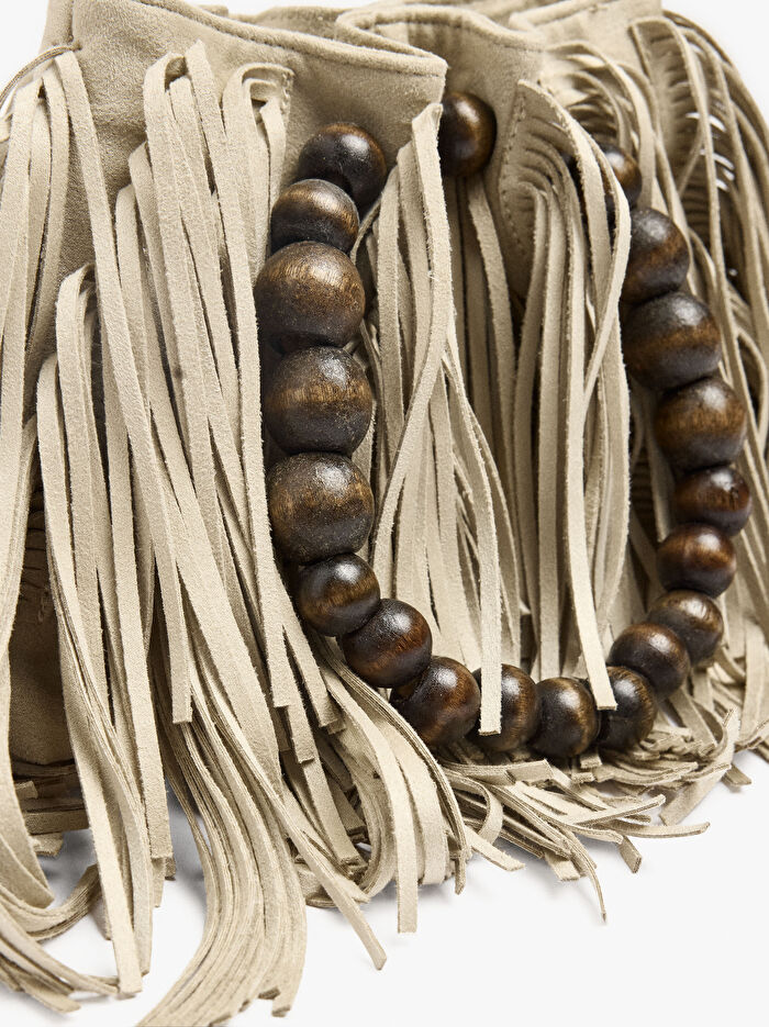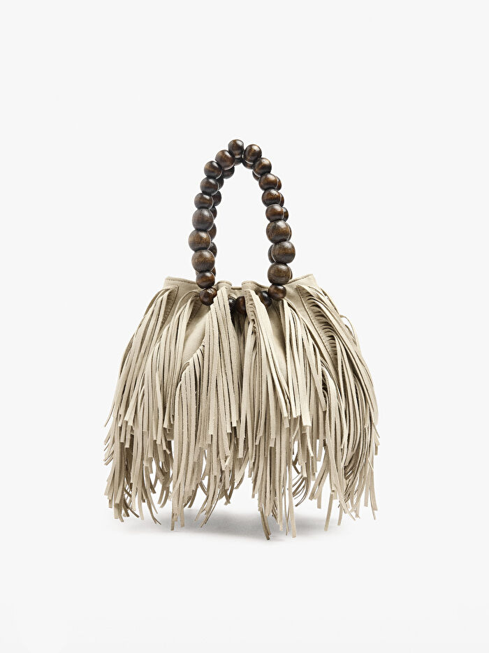 Püsküllü küçük el çantası. İç astar. Mıknatıslı kapatma. Ahşap boncuklu sabit ve yuvarlak askı. Çıkarılabilir zincir askı içerir.