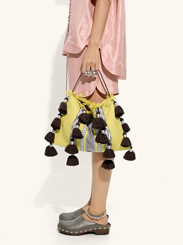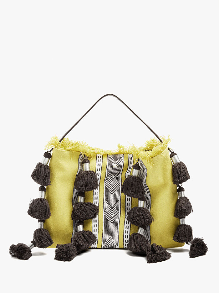 Jakarlı kumaştan dikdörtgen omuz çantası. Üst kenarları yıpranmış. Ön kısımda ve yanlarda püskül detayı. Astar ve iç cep. Mıknatıslı kapama. Sabit askı.
