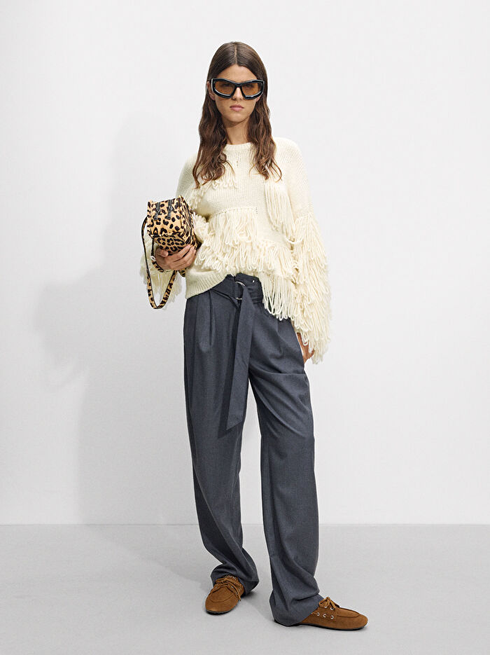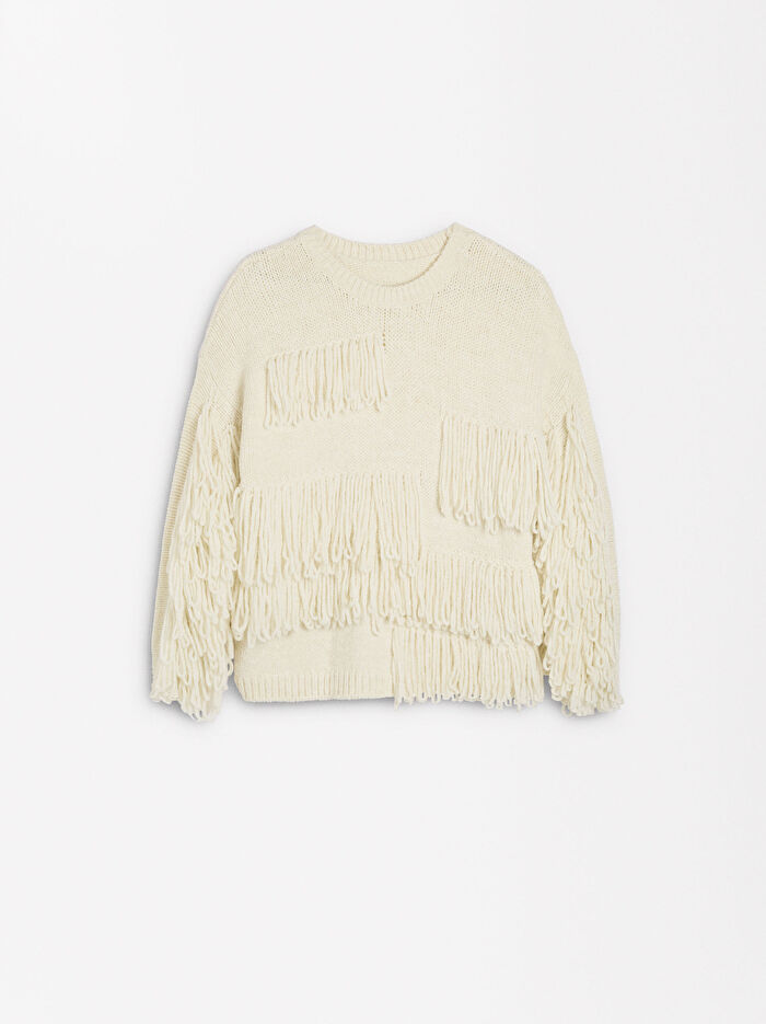 Püsküllü örme kazak. Uzun kollu. Yuvarlak boyunlu. Model 1,76 m boyundadır ve XS-S beden giymektedir.