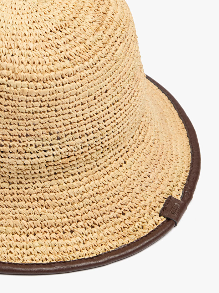 Deri efektli kenarlı hasır bucket şapka. İçte ayar ipi. Güneşten korunmak, stil ve sofistike bir dokunuş katmak için ideal aksesuar.