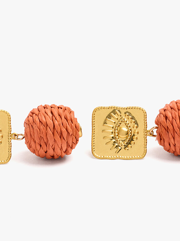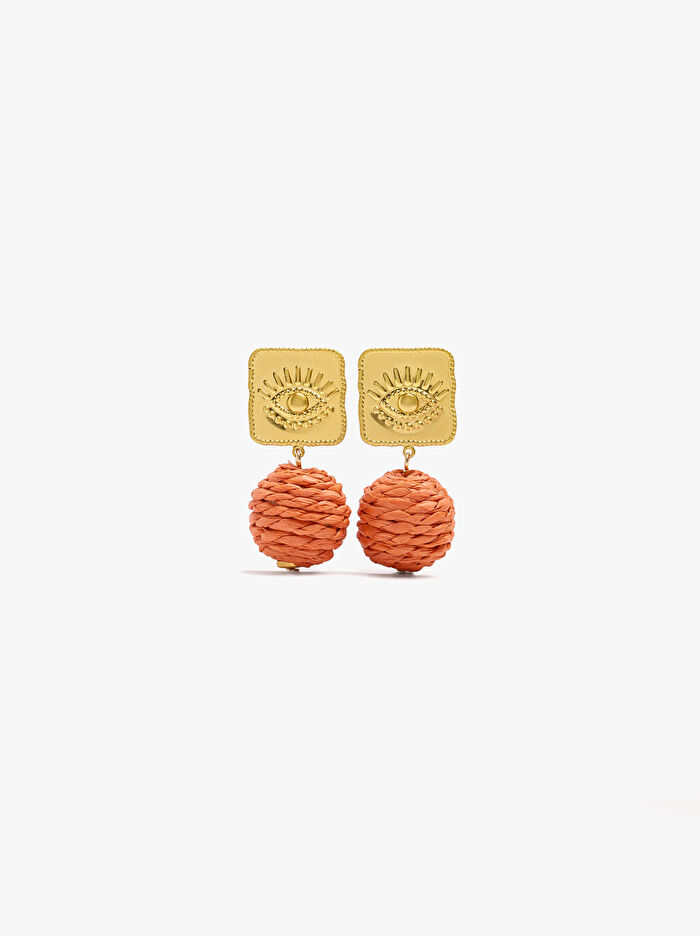 Kare şeklinde tabanlı, kabartmalı göz desenli orta boy küpeler. Tamamen örgülü rafya ile kaplanmış bir küre pandantif. Fırça efekti.