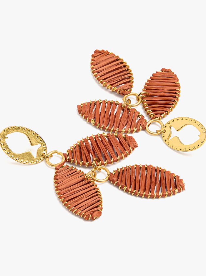 Rafya ile örülmüş yaprak şeklinde pandantifli uzun küpeler. Balık siluetli oval taban. Eskitme efekti. Altın bitiş.