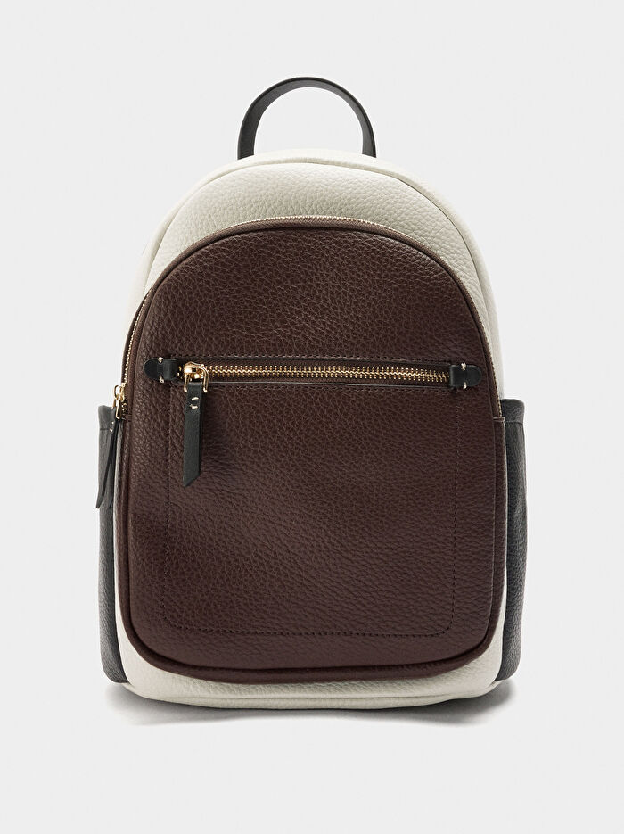 Dokulu, temel renk bloklu sırt çantası. Büyük boy. Ön ve arka kısımda fermuarlı dış cepler. Sabit el askısı. Sabit ve ayarlanabilir sırt askıları.