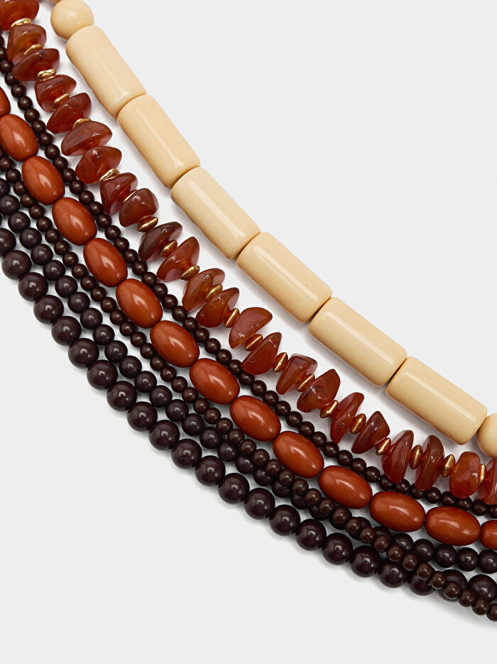 Farklı boyut, şekil ve renklerde reçine ve cam boncuklarla süslenmiş kısa çoklu kolye. Uçlarında metalik detaylar. Karides toka kapama. Parlak kaplama.