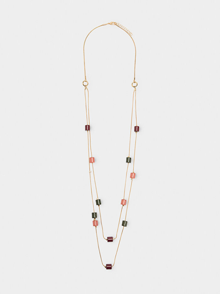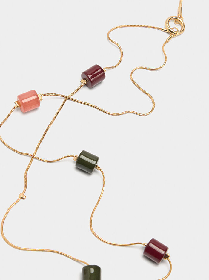 Çift etkili yılan zincirli uzun kolye. Taş efekti olan silindirik reçine detaylar. Istakoz kopçalı kapatma.