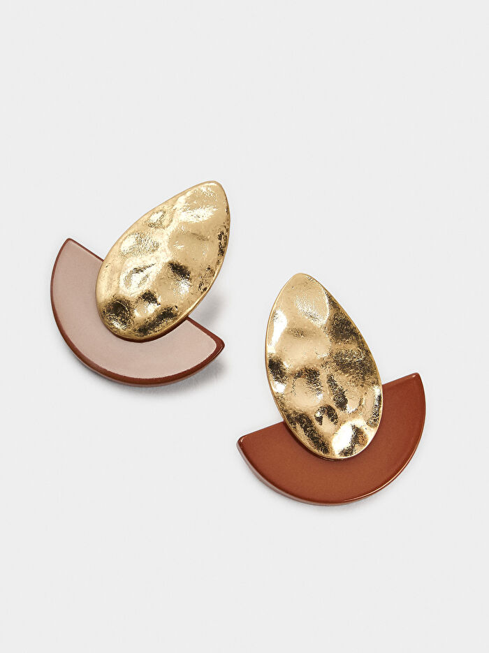 Oval tabanlı, dövülmüş efektli, yelpaze şeklinde resin küpe.