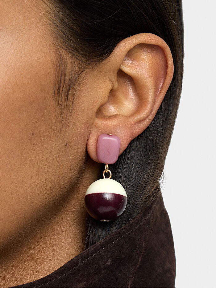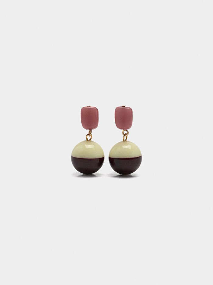 Kare tabanlı ve iki renkli küre pandantifli kısa resin küpeler. Parlak bitiş.