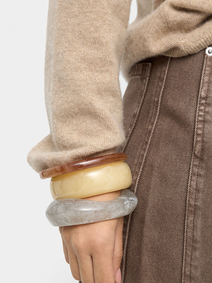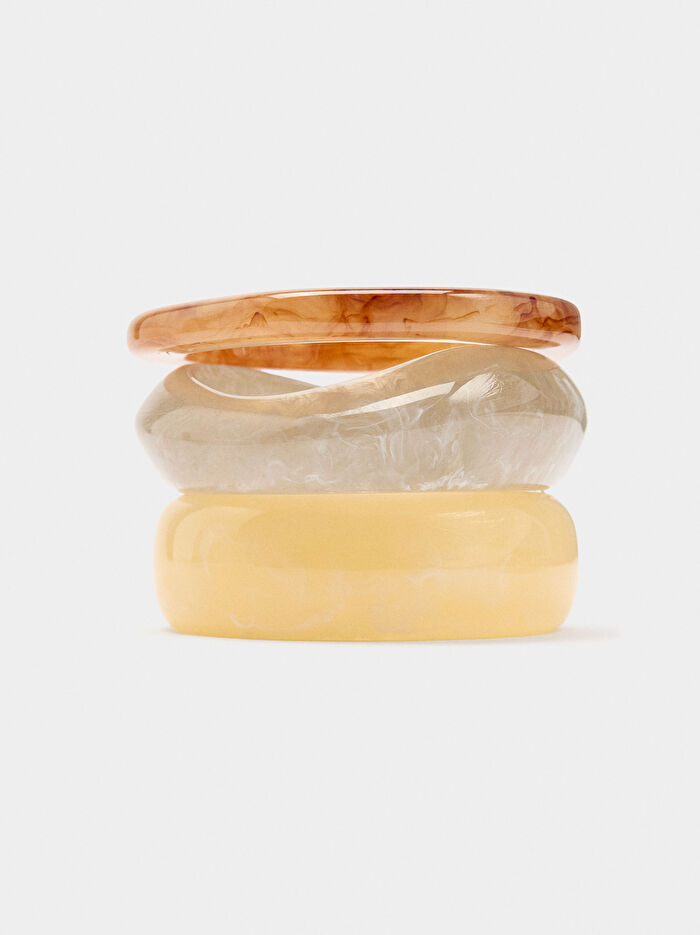 Taş efektli kaplamalı üçlü resin bileklik seti. Çeşitli renkler ve düzensiz şekiller. Parlak kaplama.