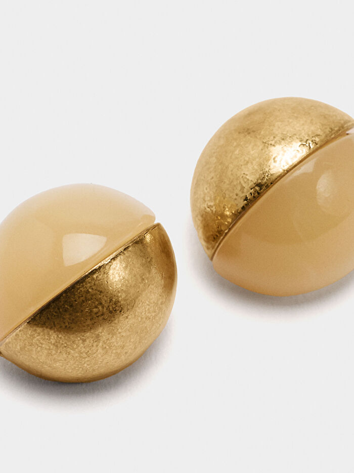 Yarısı altın renginde, diğer yarısı resinden yapılmış yarım küre küpe. Klipsli kapatma.