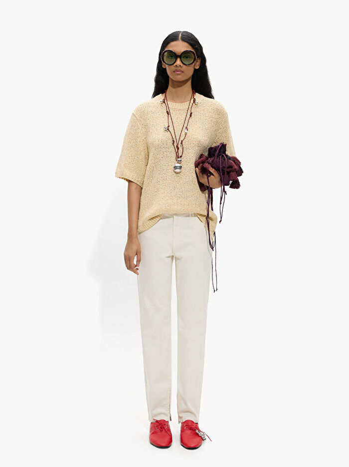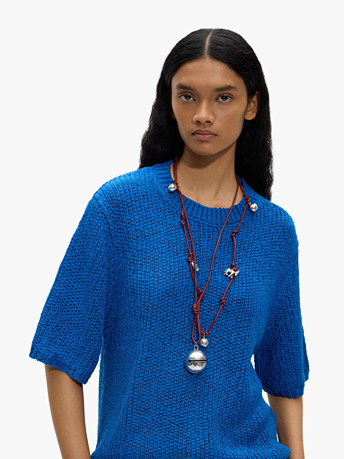 Düz örme kazak. Yuvarlak yaka. Kısa kollu. Kenarları büzgülü. Model 1,77 m boyunda ve XS-S beden giyiyor.