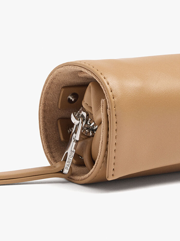 Deri görünümlü rulo takı kutusu. Kolye veya bilezikler için tutturma halkaları. Lastikli bölme. Yüzük ve küpeler için sıra. Fermuarlı sabit kutu. Çıtçıtlı ana kapak.