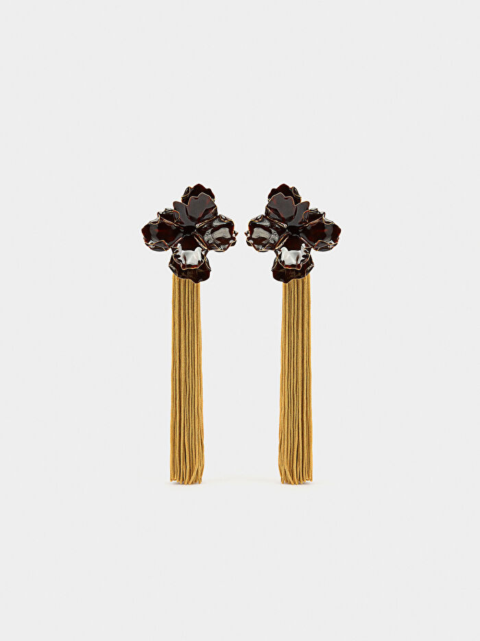 Kabartma detaylı ve emaye kaplı maxi çiçek şekilli küpe. Uzun püsküller. Düzensiz kenarlar. Klips kapatma. Parlak kaplama.