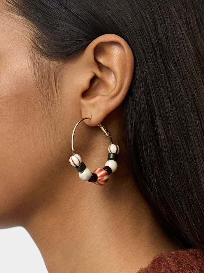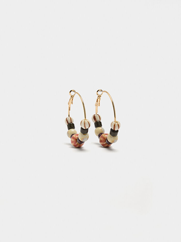 Farklı boyut ve renklerde seramik ve resin boncuklardan oluşan orta boy halka küpe
