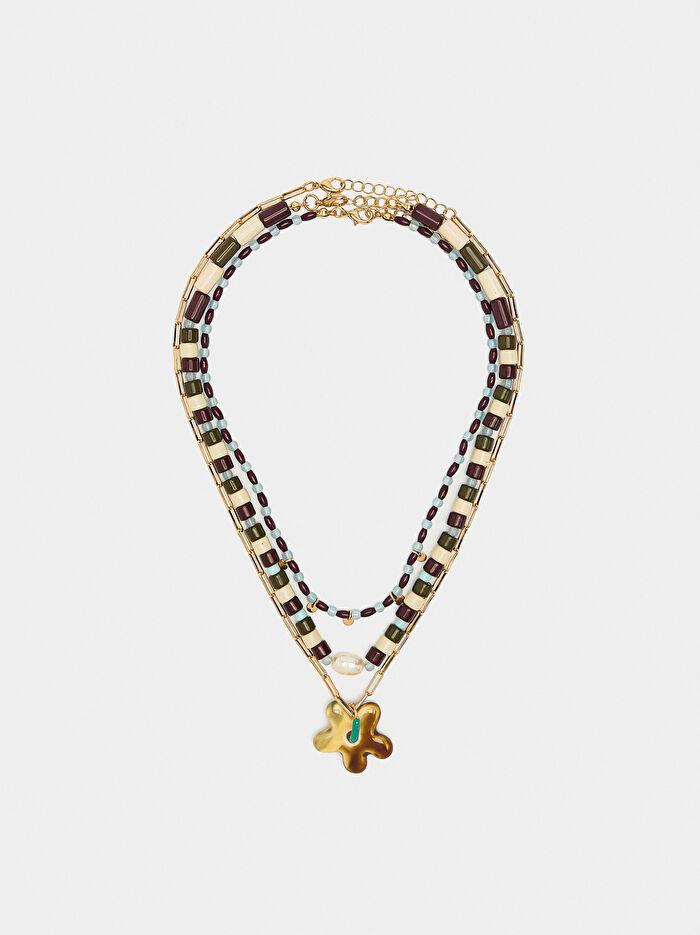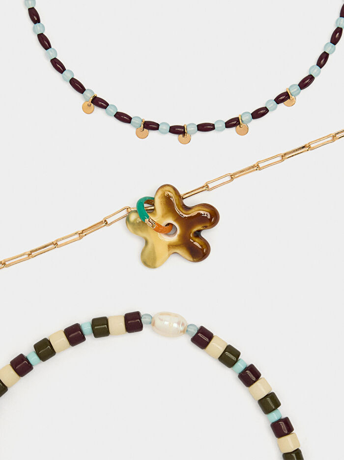 Reçine boncuklar ve halkalardan oluşan üçlü kolye seti. Karides kopçalı toka. Tatlı su incisi ve seramik çiçek şekilli aksesuar