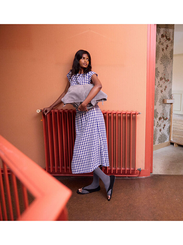 Kareli ve Büzgülü Detaylı Midi Elbise