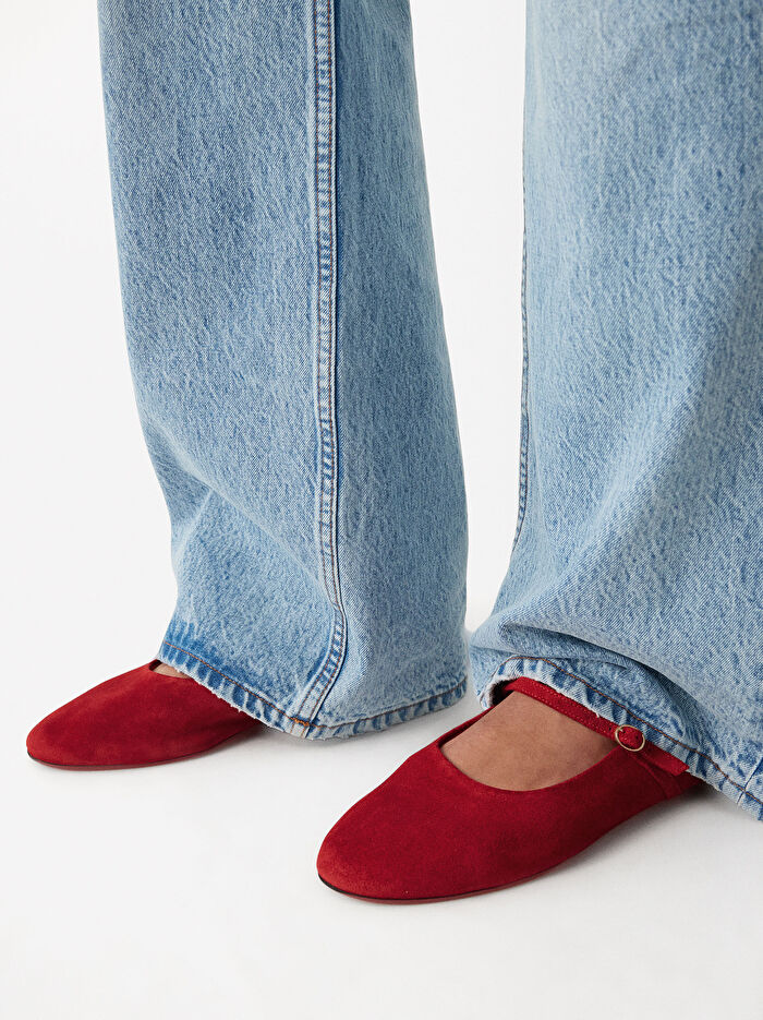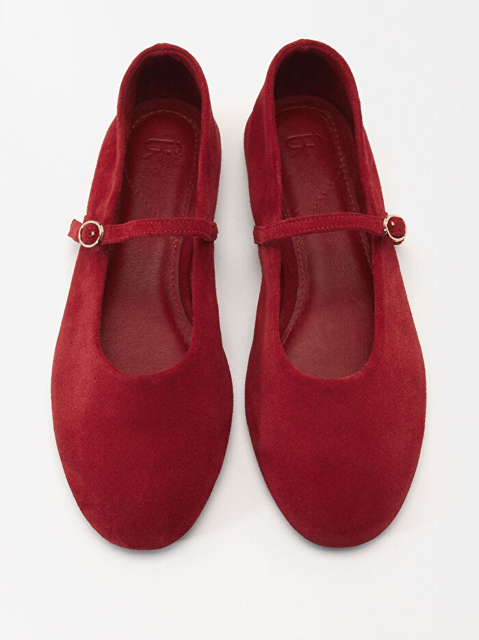 Üst kısımda bantlı ve toka kapamalı, süet deri düz babet. Yuvarlak burunlu.