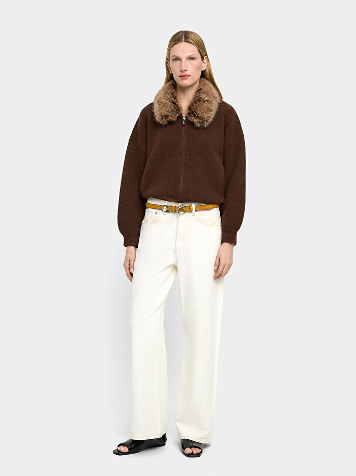 Fermuarlı örme hırka. Çıkarılabilir suni kürk efektli yaka. Uzun kollu. Yan cepler. Ribana kenarlar. Model 1,80 m boyunda ve XS–S beden giymektedir.