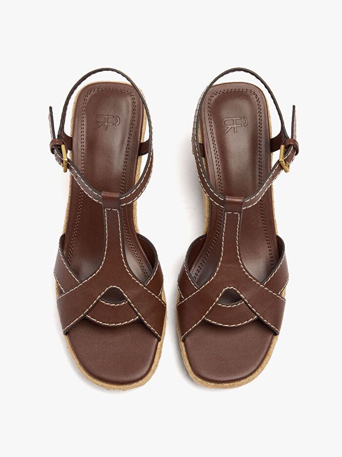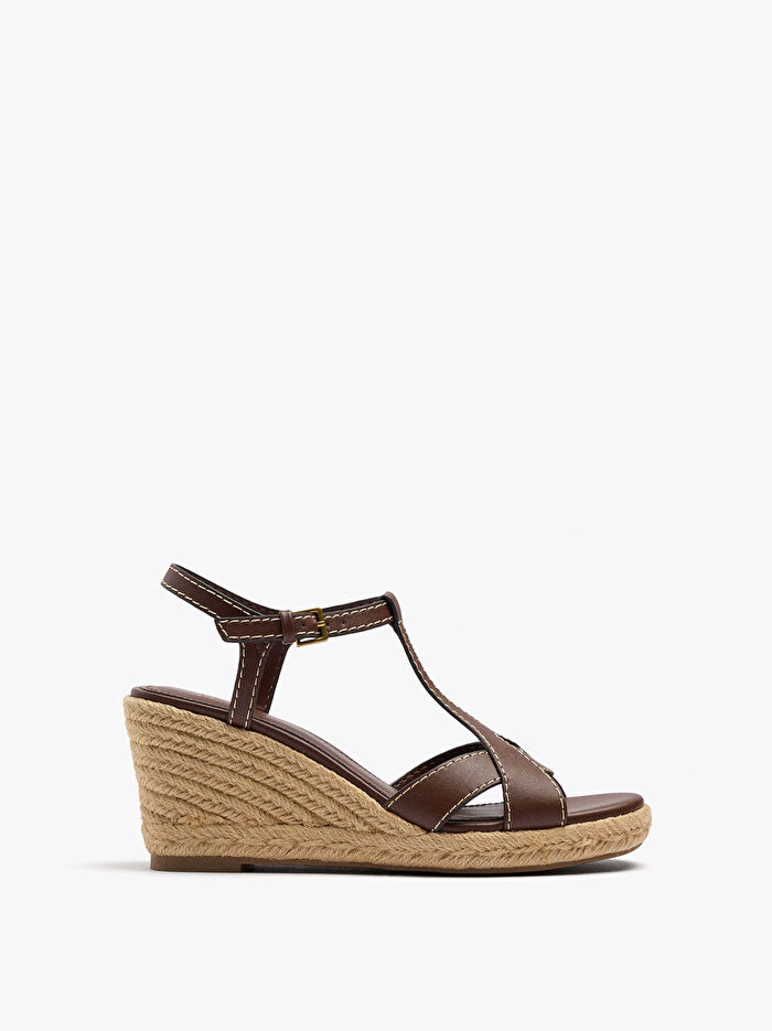 Jüt süslemeli kama topuklu sandalet. Ön kısımda T şeklinde çapraz kayışlar, ayak parmakları kısmında ayak bileği kayışlarıyla birleşiyor ve ayar için bir toka bulunuyor. Daha fazla konfor için yastıklı iç taban. Yuvarlak burun. Termoplastik poliüretan taban. Topuk yüksekliği: 8 cm.