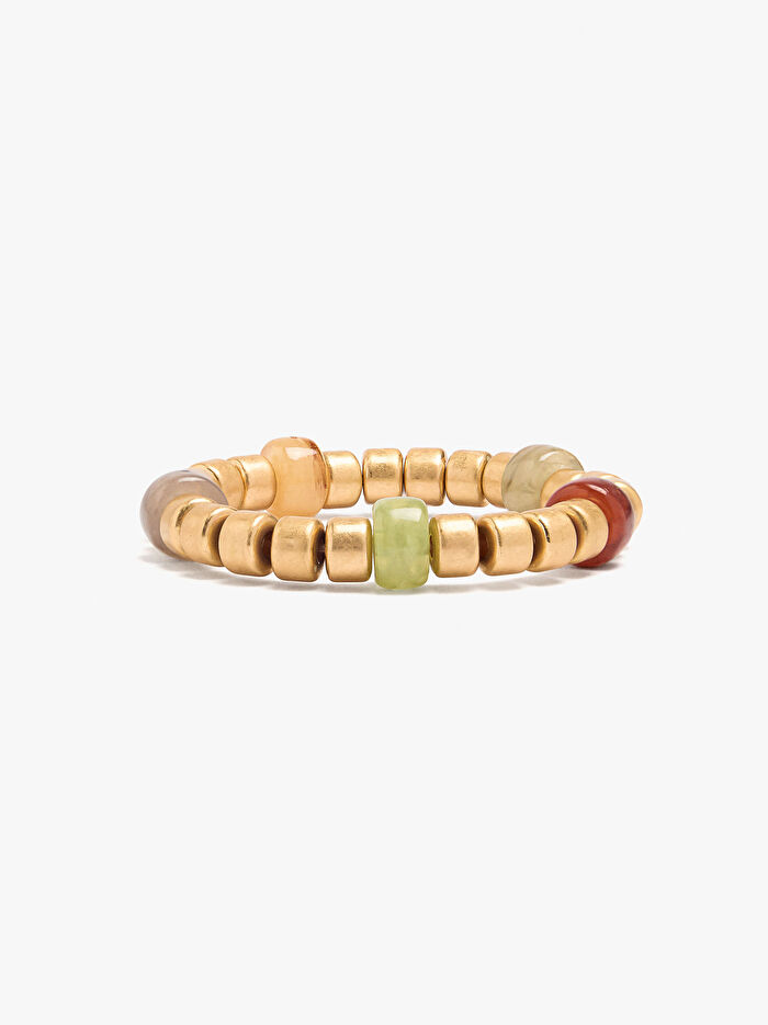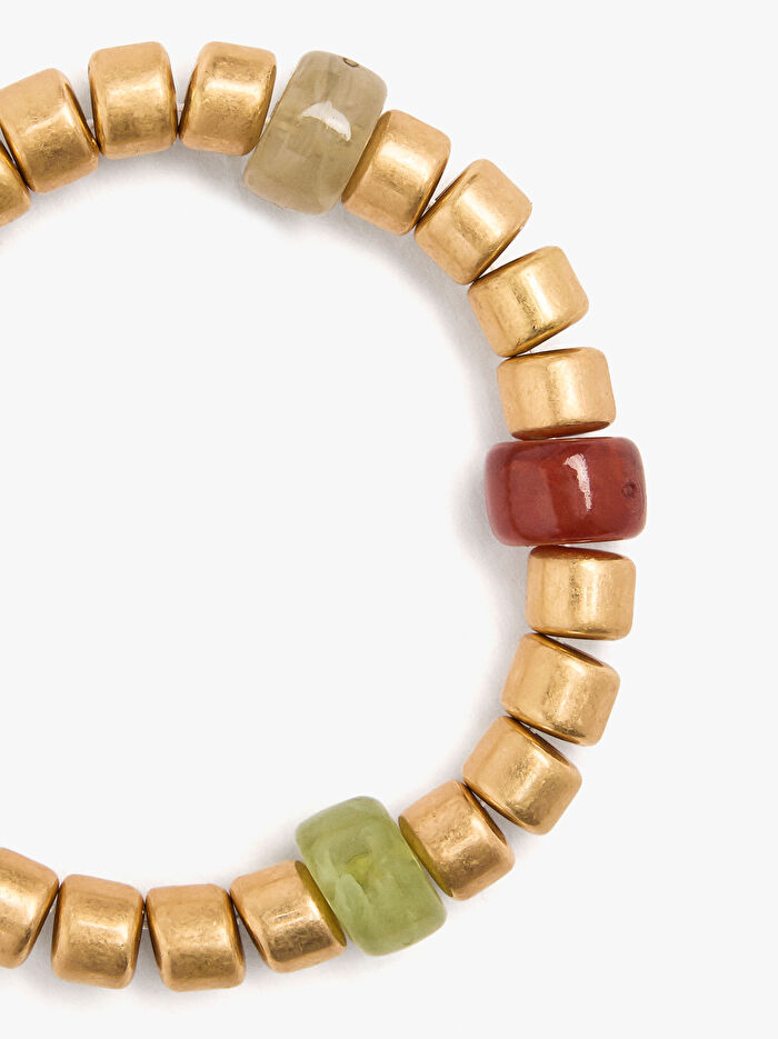 Çeşitli boyut ve renklerde silindirik boncuklardan oluşan elastik bileklik. Eskitme efektli.