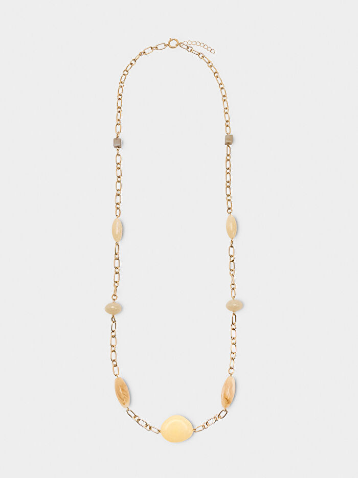 Çeşitli şekil ve boyutlarda taş efektli boncuklu uzun zincir kolye.