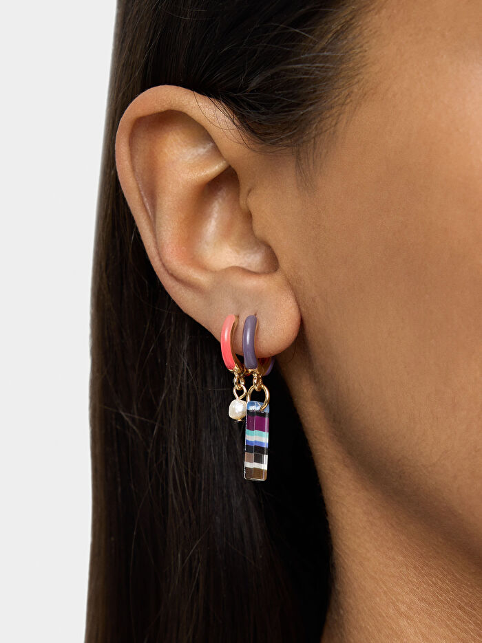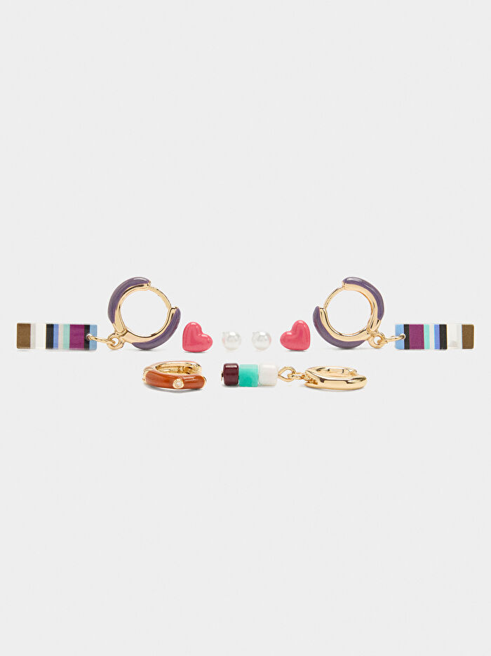 Dört çift çok renkli küpe seti: iki çift halka küpe (biri taşlı asimetrik, diğeri emaye ve resinli); iki çift kısa küpe (emayeli kalp şeklinde ve inci detaylı).