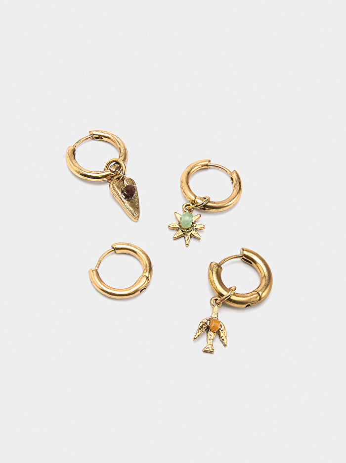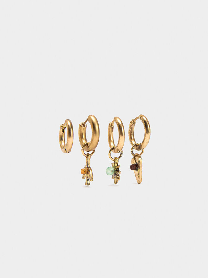 Dört adet orta boy tüp halka küpe seti. Taş ve reçine detaylı farklı şekil ve boyutlarda kolye uçları. Eskitme efektli.