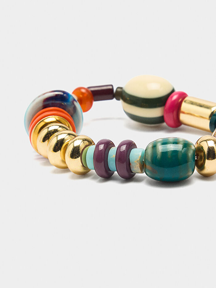 Çeşitli şekil, boyut ve kontrast renklerde taş ve seramik boncuklardan oluşan elastik bileklik.