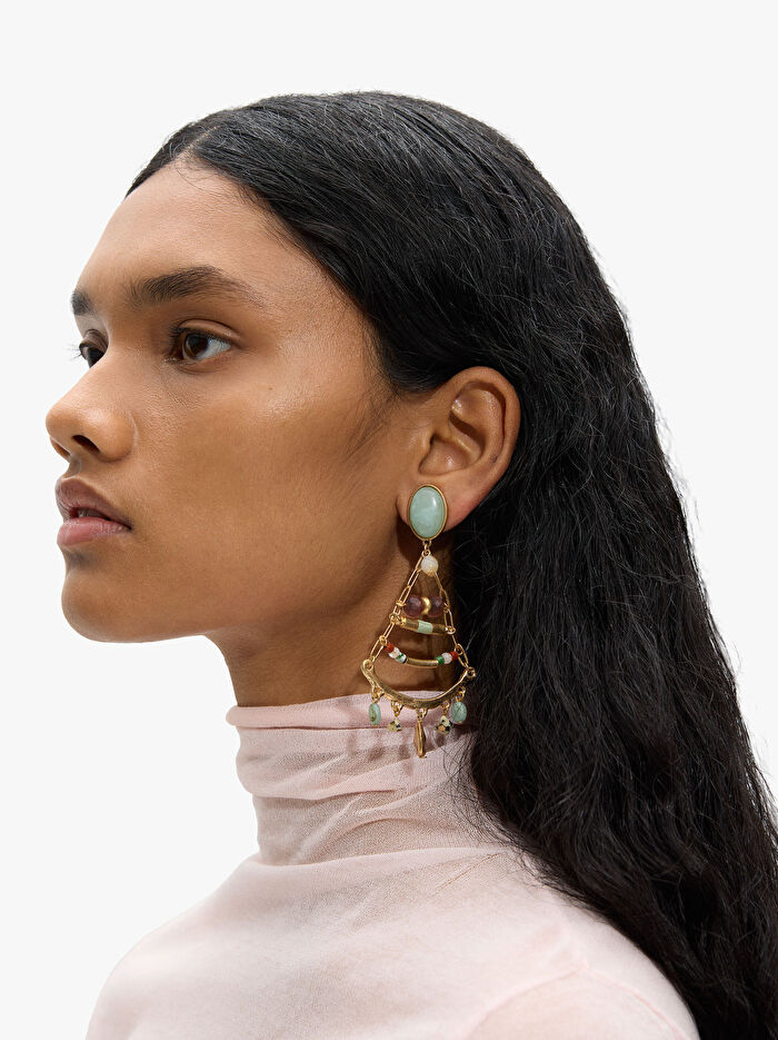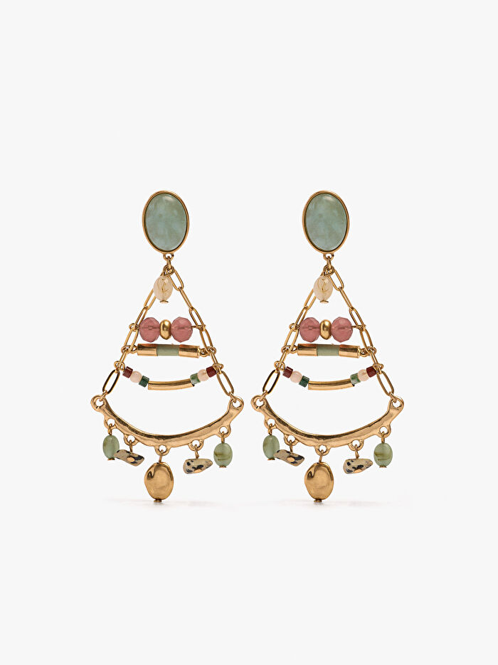 Üçgen şekilli uzun küpeler. Oval taban. Çeşitli renk, şekil ve boyutlarda taş, cam ve resin boncuk detayları. Eskitme efekti.