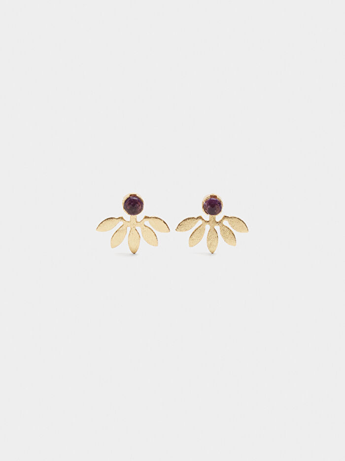 Taş detaylı kısa yaprak şekilli küpe. Fırçalanmış efekt.