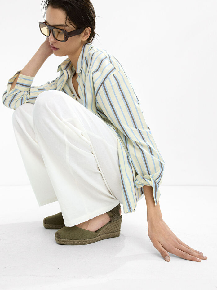 Tek renk kumaş dolgu topuk ayakkabı. Bileğe bağlanan ayarlanabilir tokalı bantlı. Kumaş iç taban. Jüt kaplama dolgu topuk. Kauçuk taban. Oval burun. Topuk yüksekliği: 8 cm.
