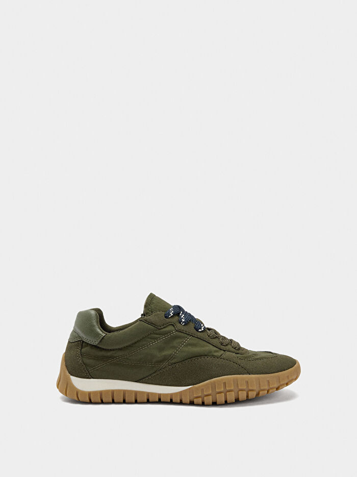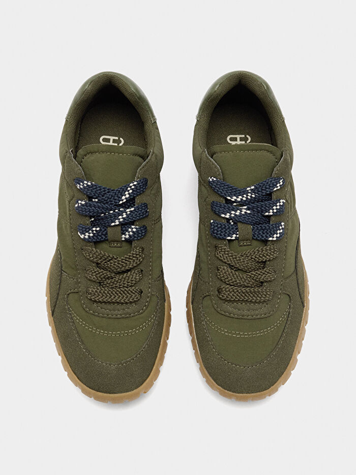 Kontrast dokulu tek renkli spor ayakkabı. İki çift bağcık: biri kontrast renkte, diğeri ayakkabının renginde. Görünür dikişler. Oval burun. Kauçuk taban.