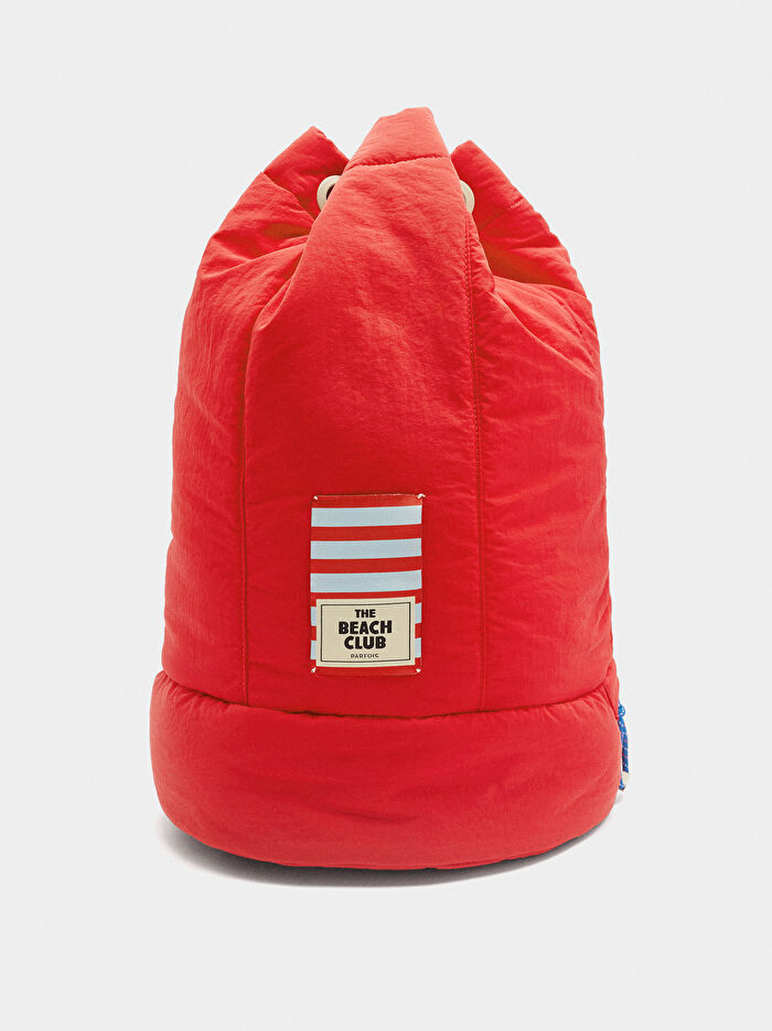 Üst dikişli teknik kumaş bucket çanta. Cepli çizgili iç astar. Omuz askısı olarak da kullanılabilen ayarlanabilir büzme ipi. Fermuarlı alt bölme.