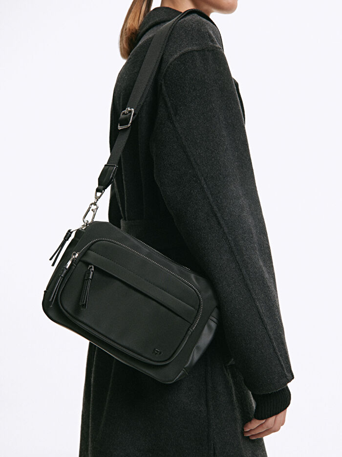 Teknik kumaş omuz çantası. Elle taşıma için üst sap. Fermuarlı iki ana bölme.İç ve ön cep.