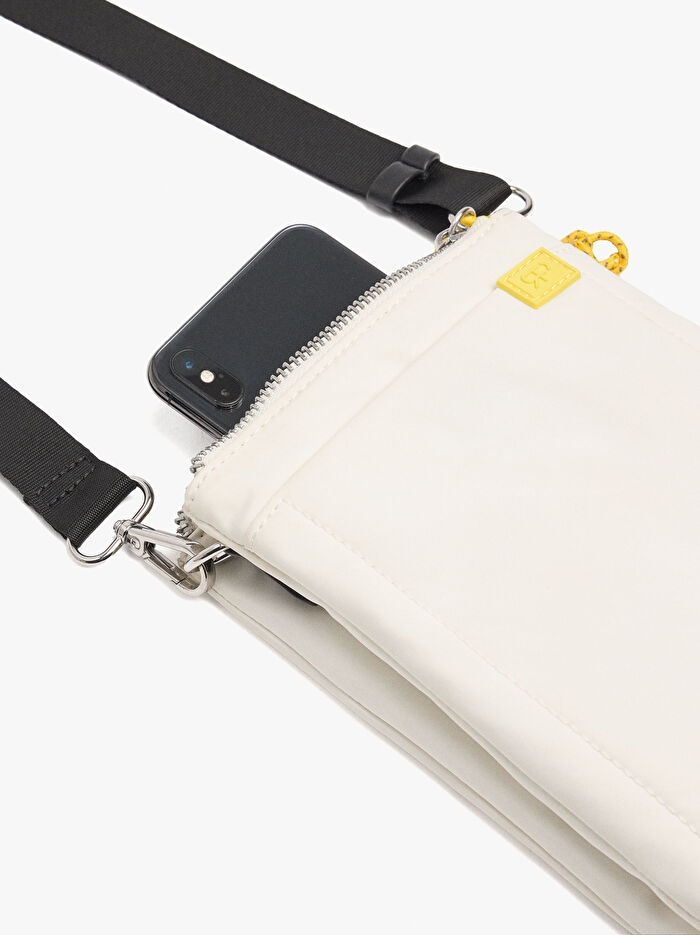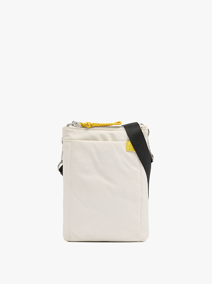Çift katlı küçük teknik kumaş çapraz askılı çanta. Dikdörtgen şekil. İç astar. Dış cep. İp detaylı fermuarlı kapamalar. Ayarlanabilir ve çıkarılabilir çapraz askılı çanta askısı.