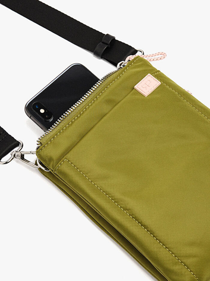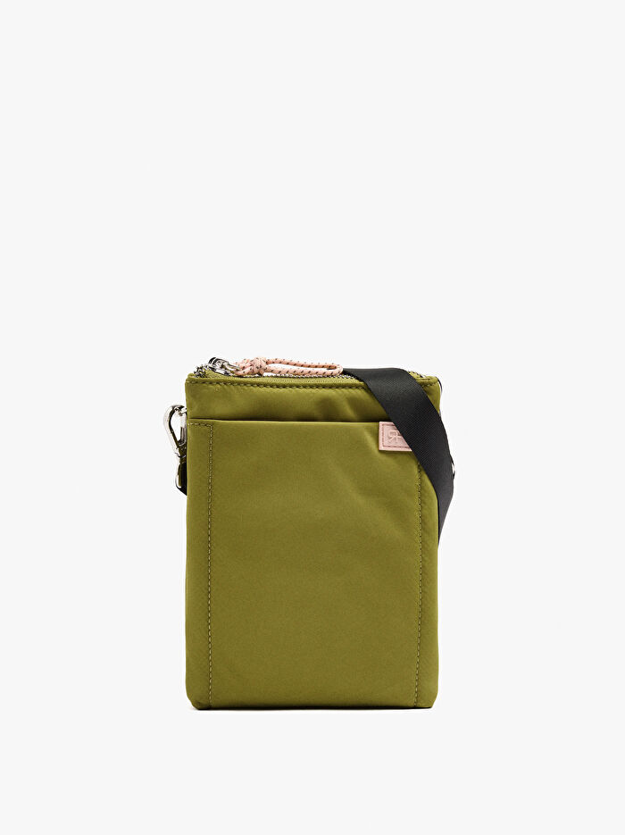 Çift katlı küçük teknik kumaş çapraz askılı çanta. Dikdörtgen şekil. İç astar. Dış cep. İp detaylı fermuarlı kapamalar. Ayarlanabilir ve çıkarılabilir çapraz askılı çanta askısı.