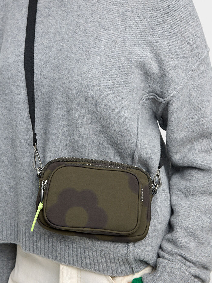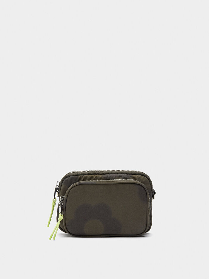 Çiçek desenli çift teknik kumaş çok amaçlı kese. İç astar. Kordon detaylı fermuarlı kapaklar. Dış cep. Ayarlanabilir ve çıkarılabilir çapraz askılı çanta askısı.