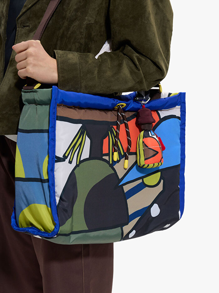 Boncuklu baskılı teknik kumaş alışveriş çantası. Astar ve iç cep. Fermuarlı kapama. Toplama için büzme ipi detayı. Sabit omuz askıları. Ayarlanabilir ve çıkarılabilir çapraz askı dahildir.