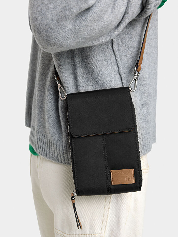 Teknik kumaş efektli cep telefonu çantası. Ortada belirgin dikişler. İki bölme, biri fermuarlı. Manyetik kapaklı kapak. Ayarlanabilir ve çıkarılabilir çapraz askılı çanta askısı.