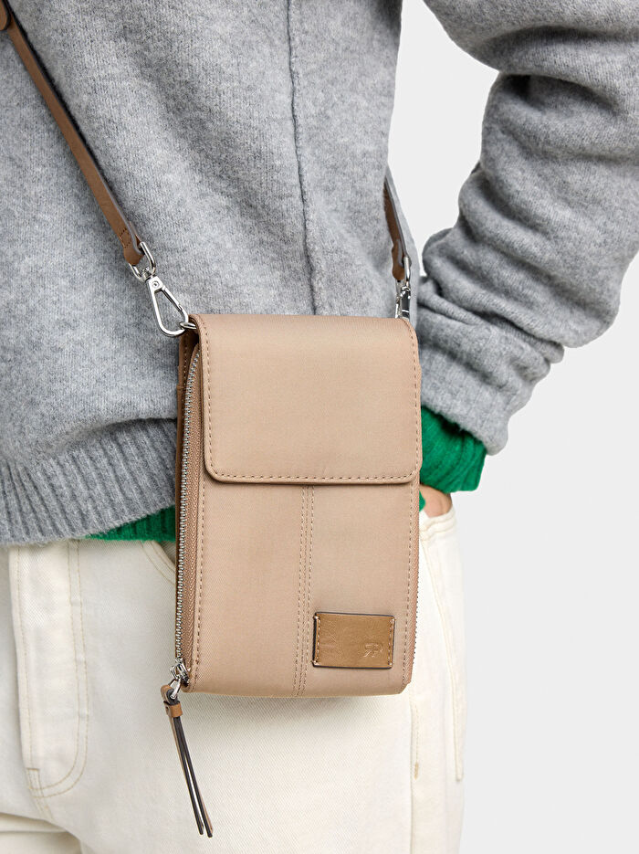Teknik kumaş efektli cep telefonu çantası. Ortada belirgin dikişler. İki bölme, biri fermuarlı. Manyetik kapaklı kapak. Ayarlanabilir ve çıkarılabilir çapraz askılı çanta askısı.