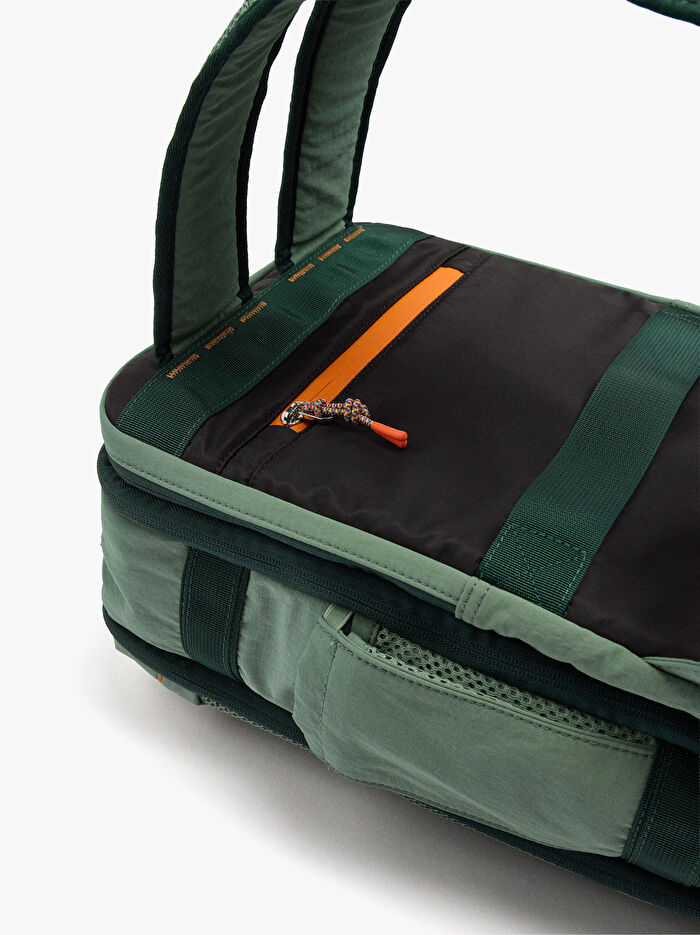 15" laptop kapasiteli, büyük kabin sırt çantası, teknik kumaşdan. İç astar. Fermuarlı kapatmalı ön ve arka cepler. Üst kısımda ve bir yanda sabit el askıları. Şişe için yan bölme. Yastıklı ve ayarlanabilir arka askılar; valize takmak için kayış. Fermuarlı ana açıklık.